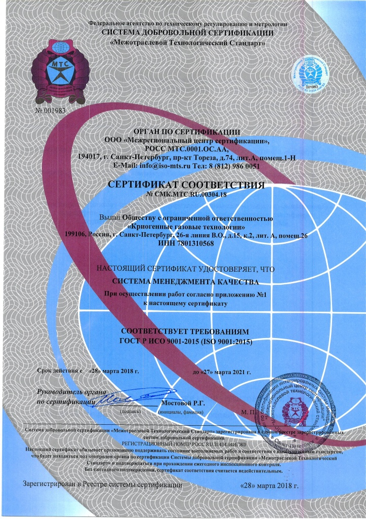 Системе менеджмента качества при осуществлении работ соответствует требованиям ГОСТ Р ИСО 9001-2015 (ISO 9001:2015) LINDE KRYOTECHNIK AG